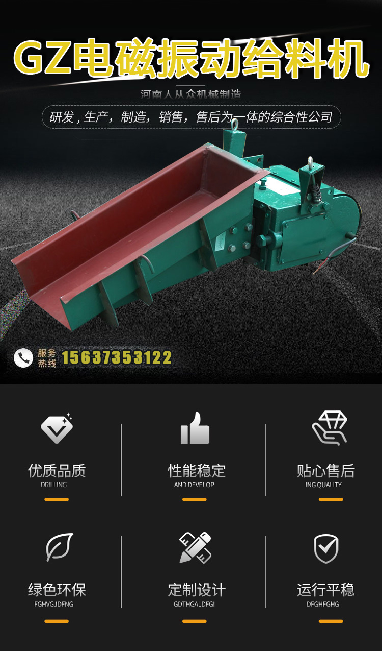 GZ電磁礦用送料機是可以使物料定向運動的雙質點彈性系統。主要工作原理是利用電磁振動器帶動罐體以一定角度來回振動,使物料沿罐體移動。